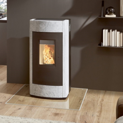 La stufa REVO unisce un design sobrio e minimalista alla pietra naturale e a un grande serbatoio per il pellet.